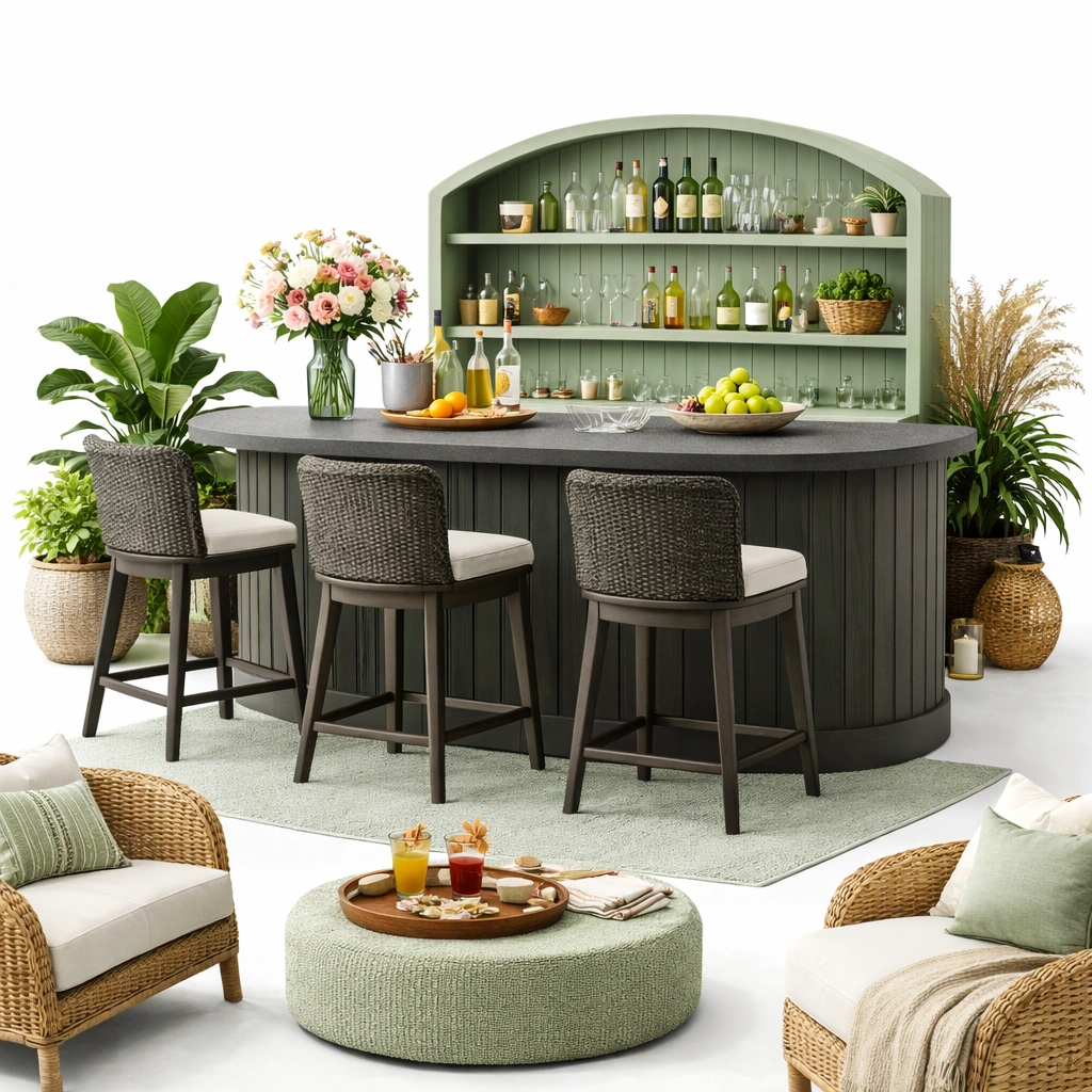 Beschreibung: Diese moderne Gartenbar in Gruen bietet eine elegante Optik und hohe Funktionalitaet. Die stabile Konstruktion und grosszuegige Ablageflaechen machen sie ideal fuer Garten oder Terrasse.