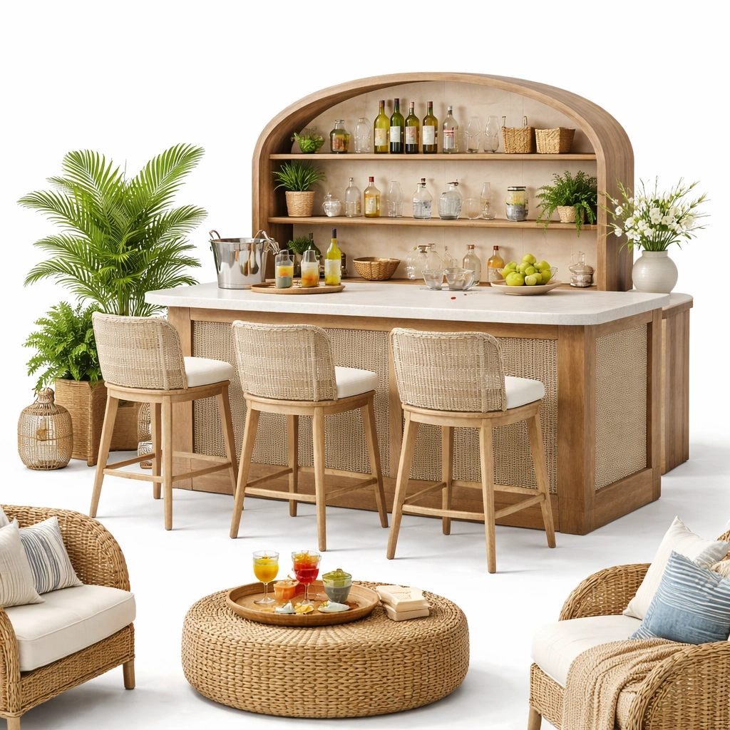Beschreibung: Diese Gartenbar aus Holz mit integriertem Regal bietet viel Stauraum fuer Getraenke und Zubehoer. Die stabile Bauweise und die robuste Arbeitsflaeche machen sie ideal fuer Garten oder Terrasse.