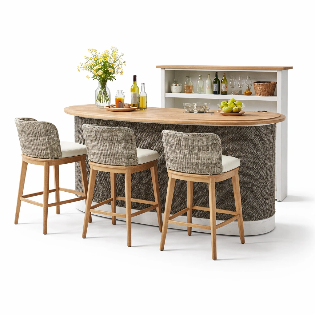 Beschreibung: Diese Gartenbar kombiniert eine helle Optik mit natuerlichen Materialien. Die grosszuegige Arbeitsflaeche und stabile Bauweise machen sie ideal fuer entspannte Stunden im Garten.