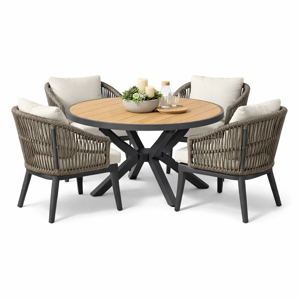 Beschreibung: Diese moderne Garten Essgruppe in Grau bietet ein stilvolles Design und hohen Komfort. Die stabile Konstruktion und langlebigen Materialien sorgen fuer eine langfristige Nutzung im Aussenbereich.