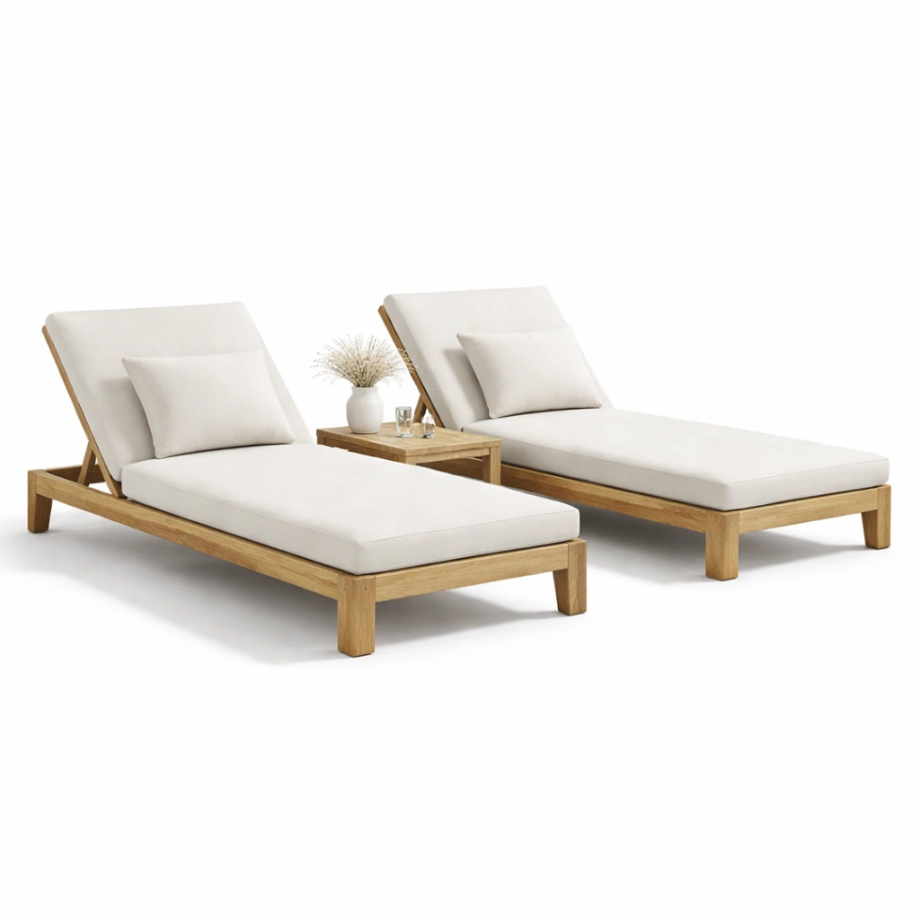 Beschreibung: Dieses minimalistische Gartenliegen Set aus Holz bietet eine klare Optik und hohen Komfort. Die stabilen Materialien und das schlichte Design passen perfekt in jeden Aussenbereich.